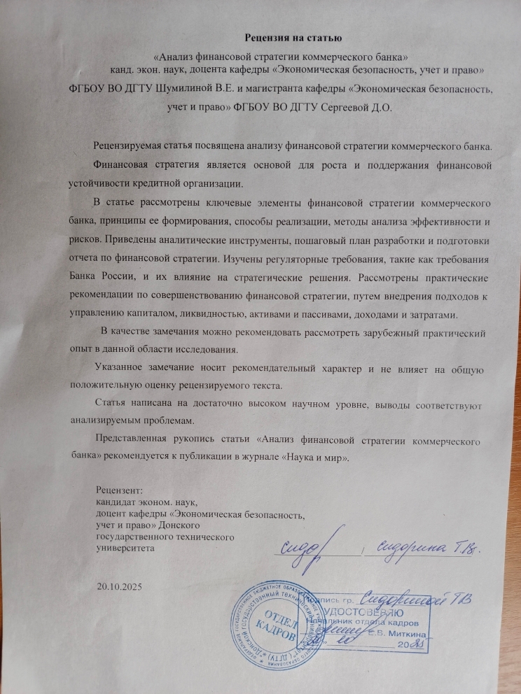 Представленная рукопись статьи «Анализ финансовой стратегии коммерческого банка» рекомендуется к публикации в журнале «Наука и мир».