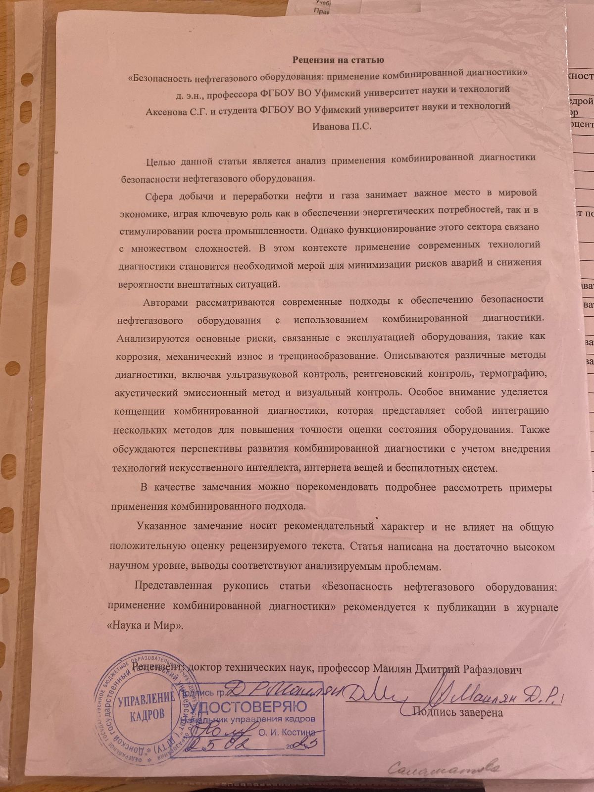 Представленная рукопись статьи «Безопасность нефтегазового оборудования: применение комбинированной диагностики» рекомендуется к публикации в журнале «Наука и Мир».