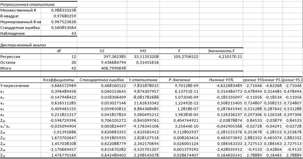 Используя программу «Регрессия» из Пакета анализа Excel построим эконометрическую модель множественной нелинейной регрессии (1), учитывая особое влияние фактора X4. Для улучшения качества модели (1) были введены фиктивные переменные Z12 , Z16 , Z26, Z29, Z33 , Z34 , значения которых равны 1 в указанных периодах, остальные значения равны 0.