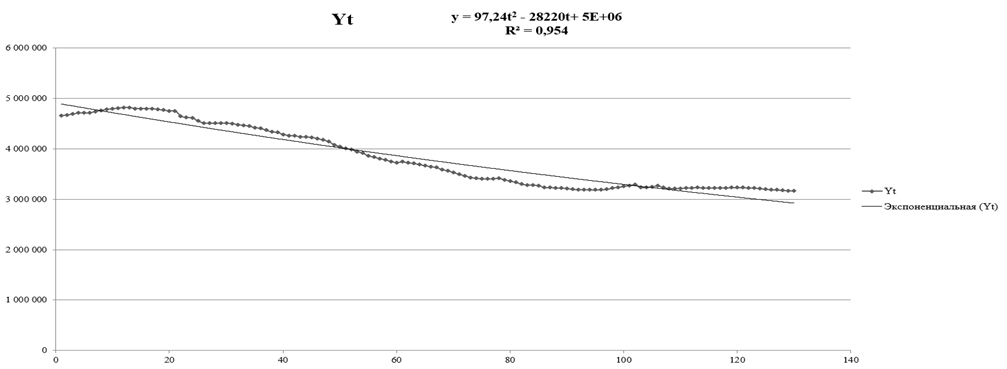 (Y_t ) ̂ = 3167106,454 –6013,152·τ + 0,5·184,823·τ2.