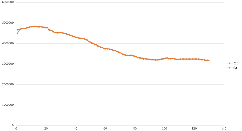 Для построения адаптивной модели в качестве начальных данных используем коэффициенты полиноминального тренда (2) :a ̂_1,0=5123355,348; a ̂_2,0=- 28220,17;( a) ̂_3,0=97,245. Выберем параметр адаптации α = 0,8, β = 1 – α = 0,2. Таким образом, наиболее свежим (последним) данным во всем временном ряду будет уделяться большее внимание и придаваться больший вес, что наиболее важно в современных условиях, характеризующихся экономическими сдвигами и быстрыми темпами изменений [8].