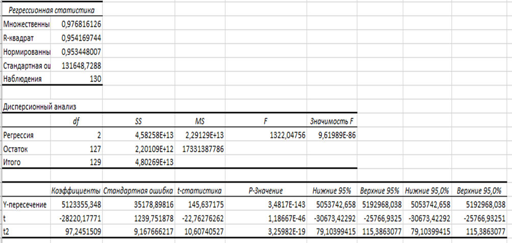Для повышения точности прогноза используем множественную регрессионную модель. Исследование проведем с помощью программного средства Microsoft Excel. В разделе «Анализ данных» выберем вкладку «Регрессия». В результате обработки временного ряда была построена полиномиальная регрессионная модель (2), получены значения коэффициентов уравнения, а также дисперсионный анализ, представленный на рис.3.