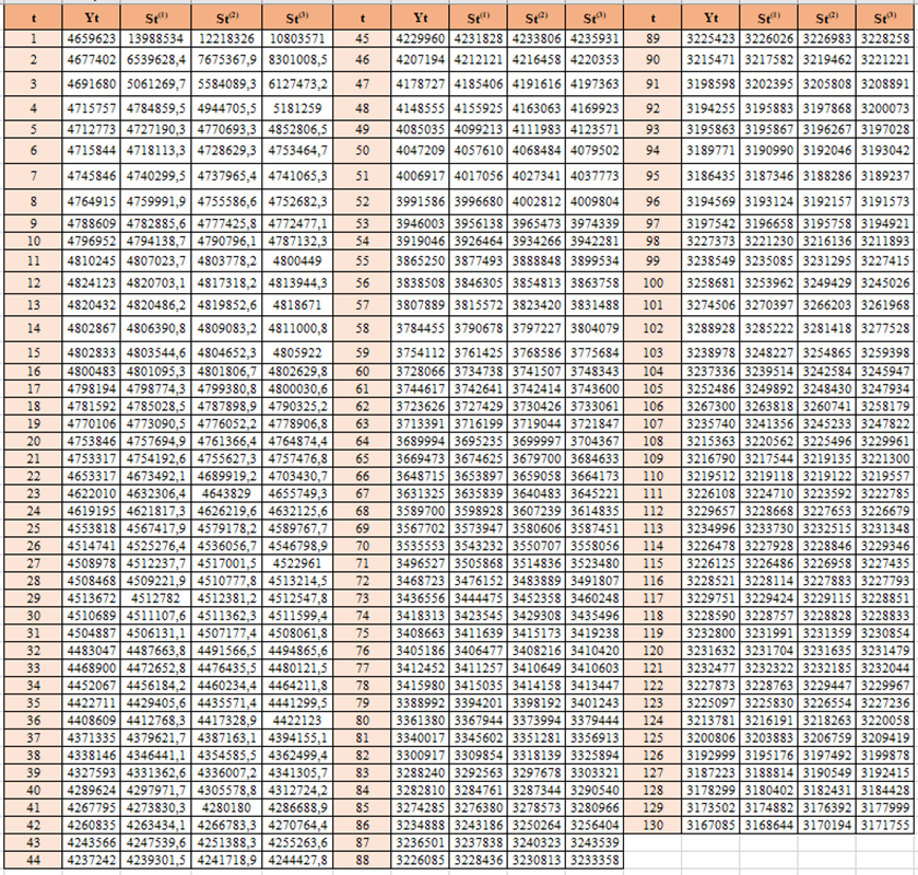 Исходя из анализа формулы полиноминальной адаптивной модели (3) сделаем вывод о необходимости расчета её коэффицентов, при этом наибольший интерес представляют значения последнего месяца. Коэффициенты данной модели a ̂_(1,t), a ̂_(2,t), a ̂_(3,t)обновляются на каждом последующем шаге по формулам: