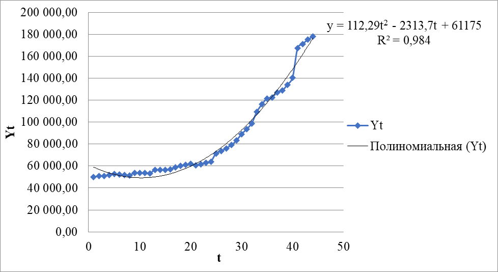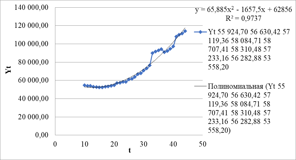 (Y_t ) ̂ = 65,885t2 – 1657,5t + 62856. (2)