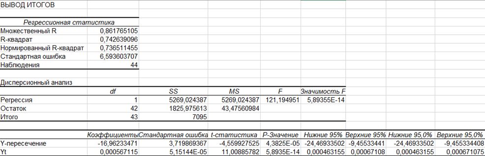 Для регрессионного анализа произведем оценку коэффициентов уравнения линейной регрессии через «Пакет анализ» Microsoft Excel, инструмент «Регрессия». Результаты представлены на рис. 4.