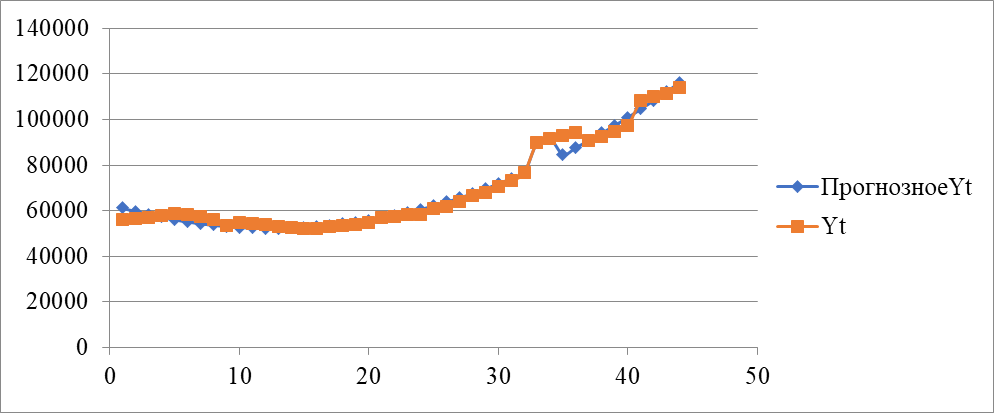 Если данное число выразить в процентном виде, то получается, что средняя ошибка составляет 1,6%. Это свидетельствует о том, что оставшаяся часть 98,4% – доля дисперсии уровней временного ряда, объясненная построенной данной моделью.