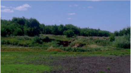 Водоем № 4 и ГТС. Общий статус: Земляная плотина также просела, плоскость размыта. Функциональность утрачена. Идентифицировать объект как ГТС невозможно. Показано на рис. 9.